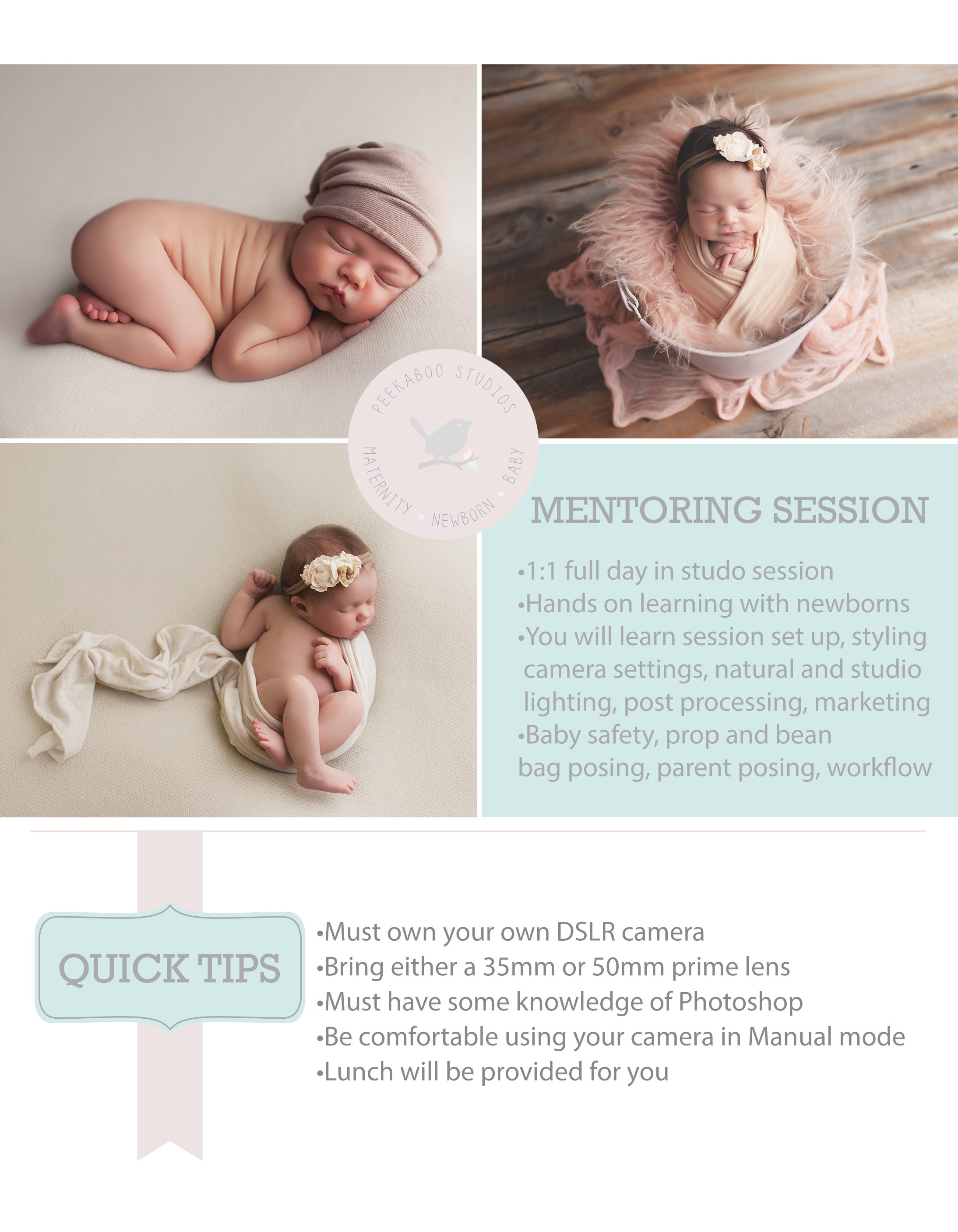 Want to take your newborn photography to the next level? We offer one on one mentoring sessions for those looking to learn hands on. Newborn photography is such a specialized field with baby’s safety being of the upmost importance. Learning how to safely pose and sooth a newborn from an experienced professional is so important and will provide you with much more confidence handling newborns. Throughout your mentoring session we will work one on one and go over everything, such as setting up for a session, prop selection and poses, poses, workflow, camera settings, studio & natural light, safety and soothing, parent posing, editing and post processing, marketing and social media. During your session you will be encouraged to take images of each setup so you can use them for your portfolio.